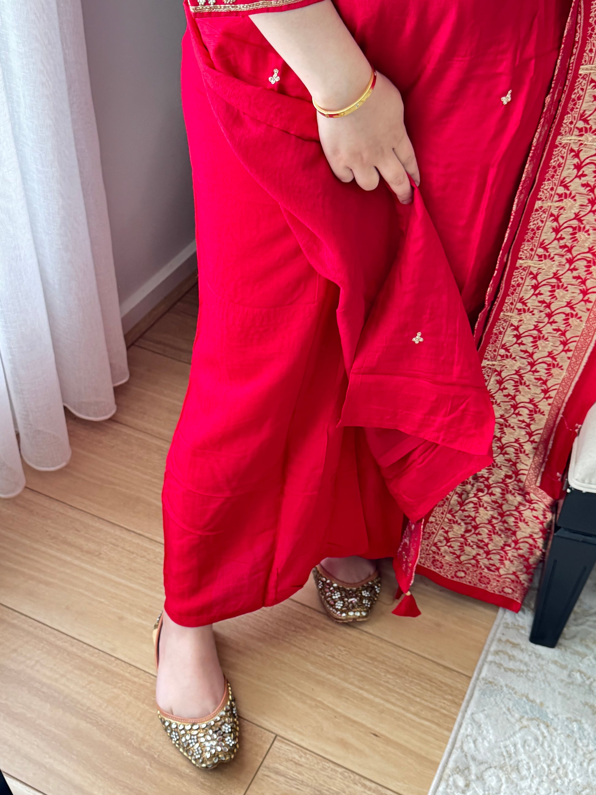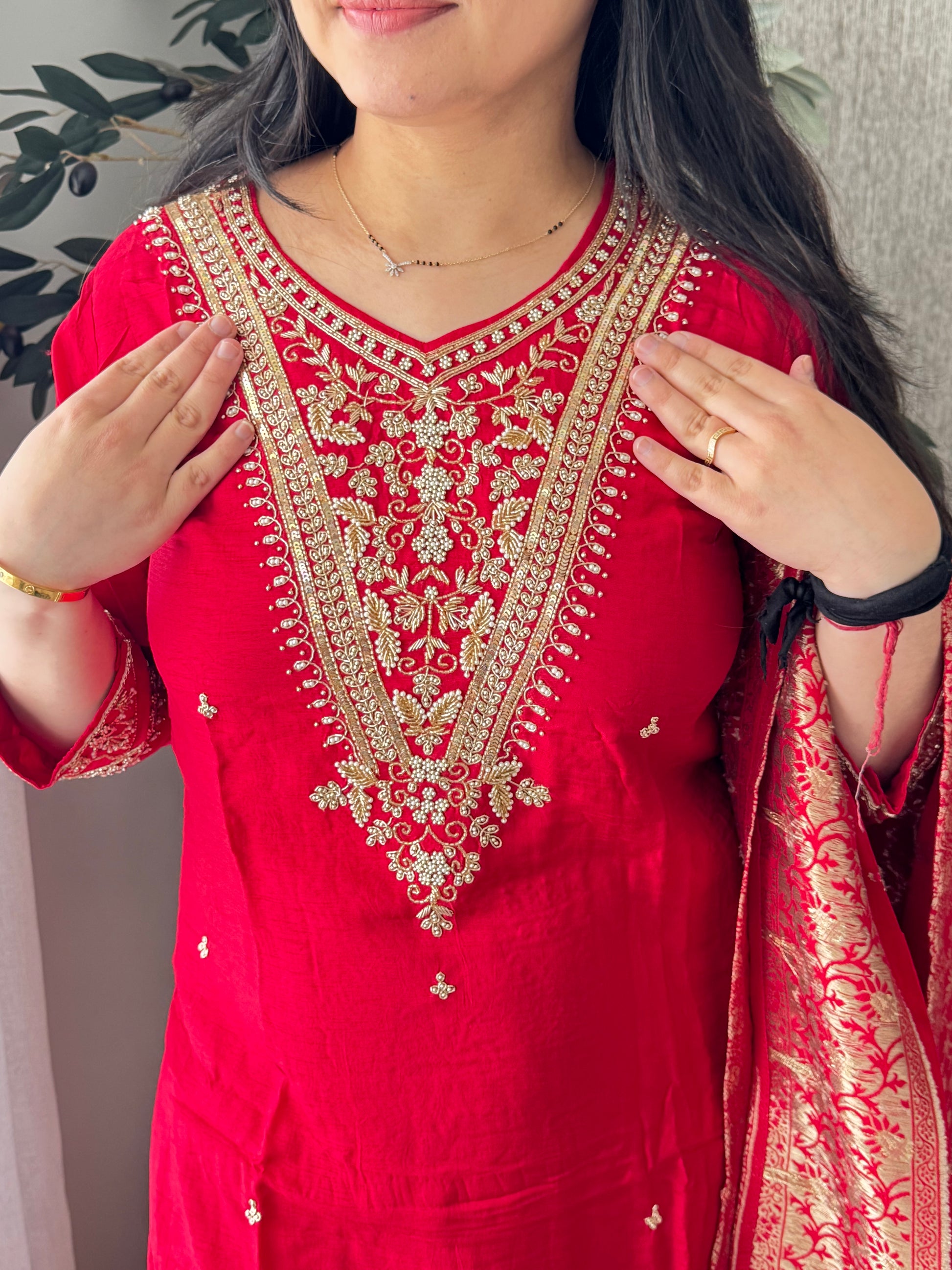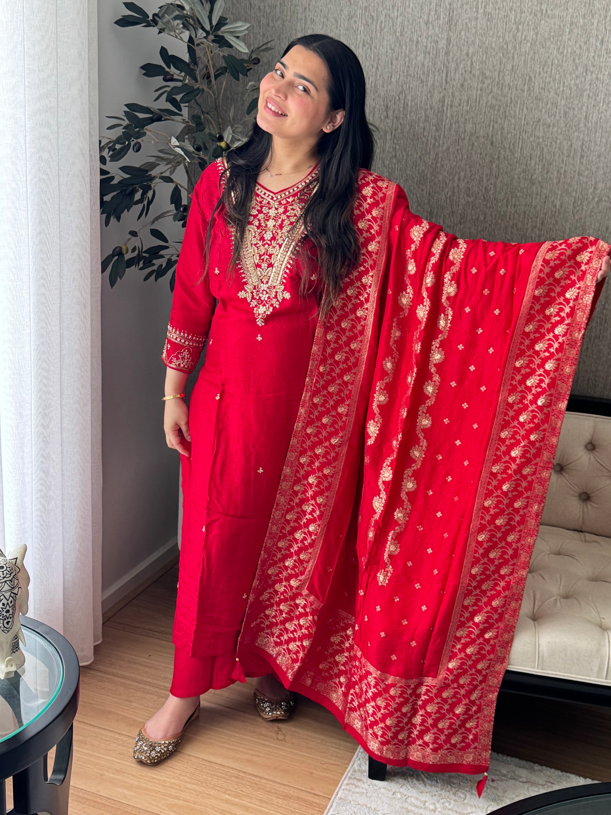 Premium quality silk straight suit with banarsi dupatta And plazzo pants