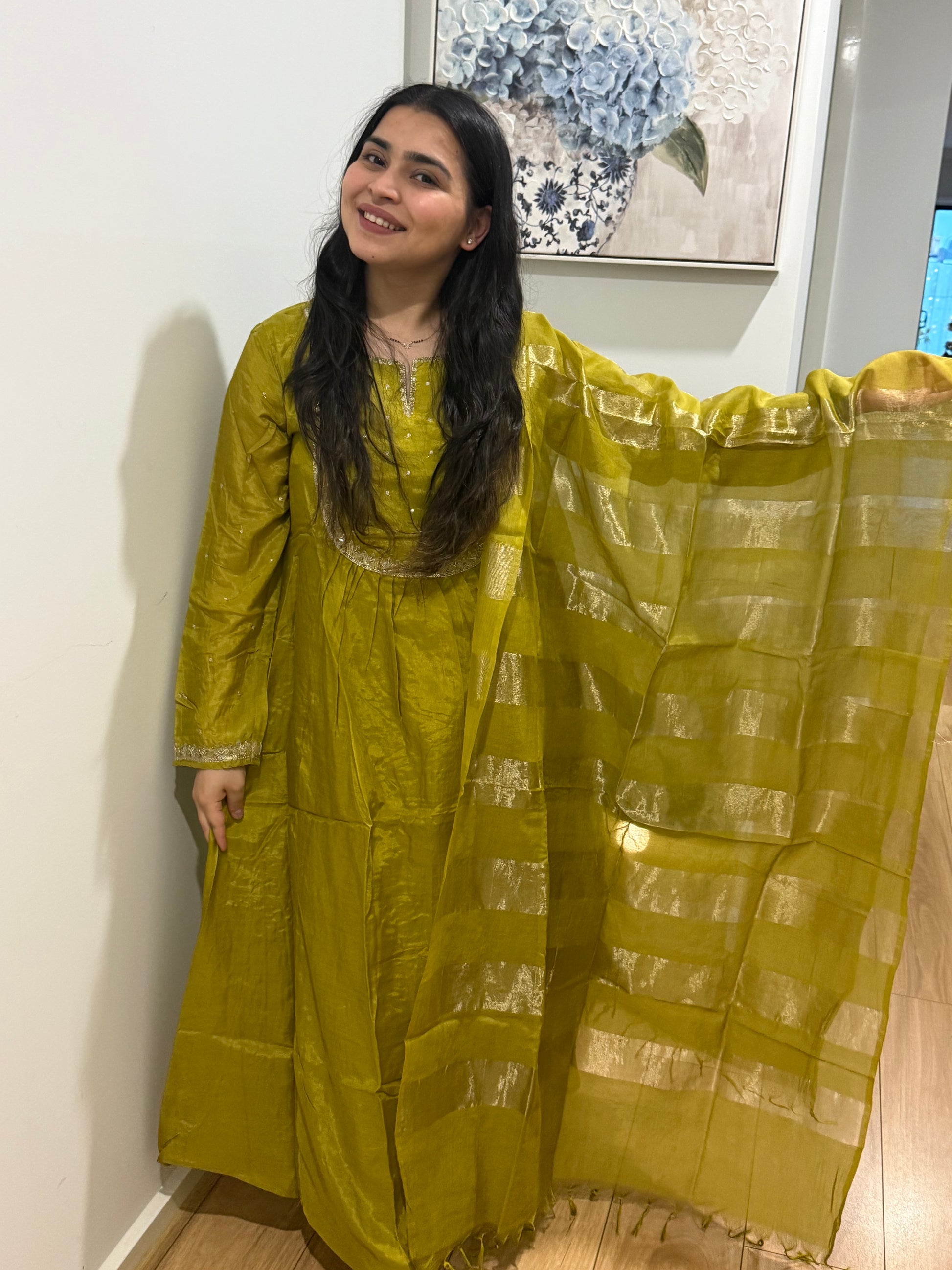 Premium quality mul chanderi anarkali suit with lining and handwork on the yoke and sleeves. Luxury dupatta on mul chanderi fabric and straight pants