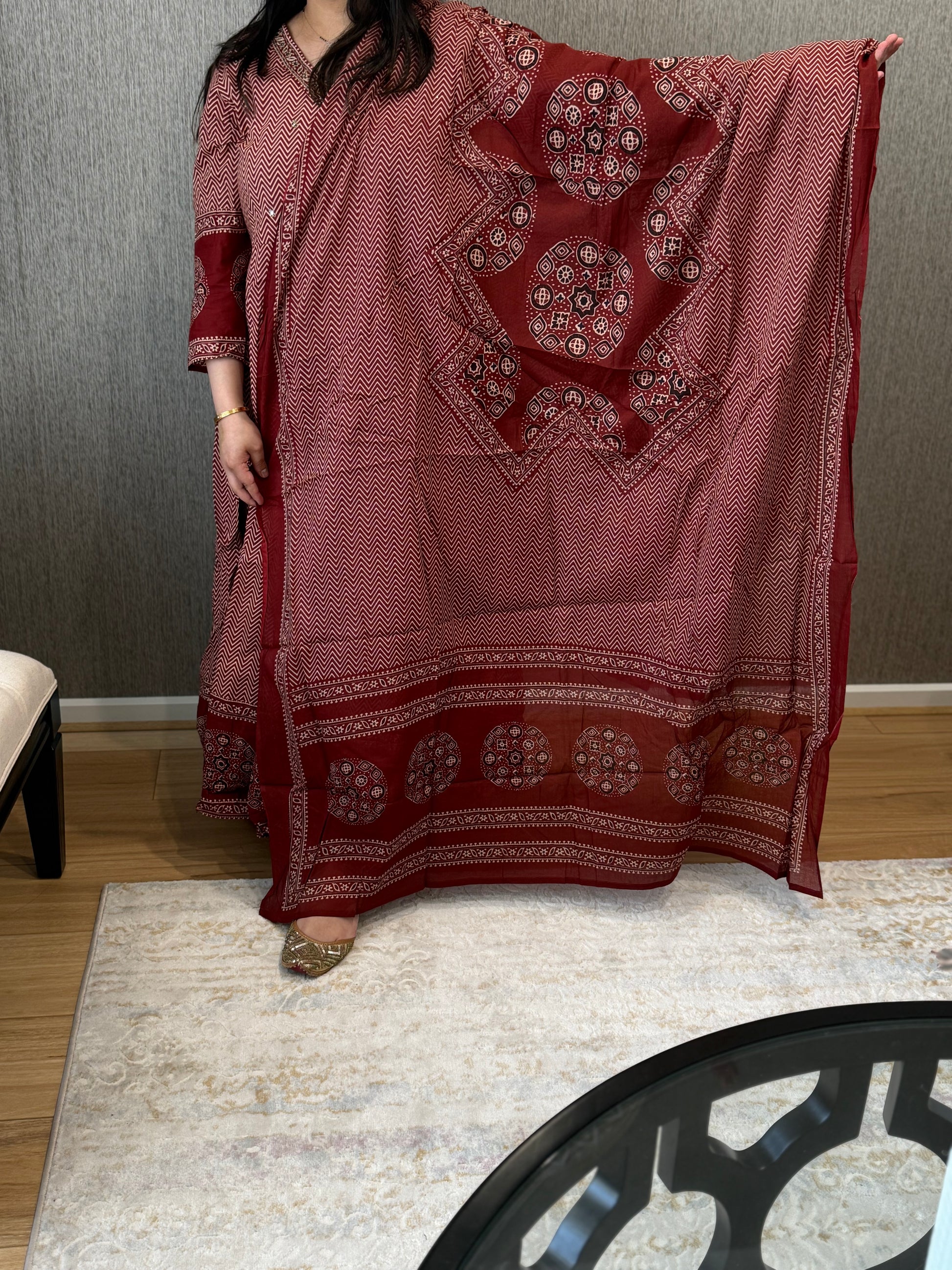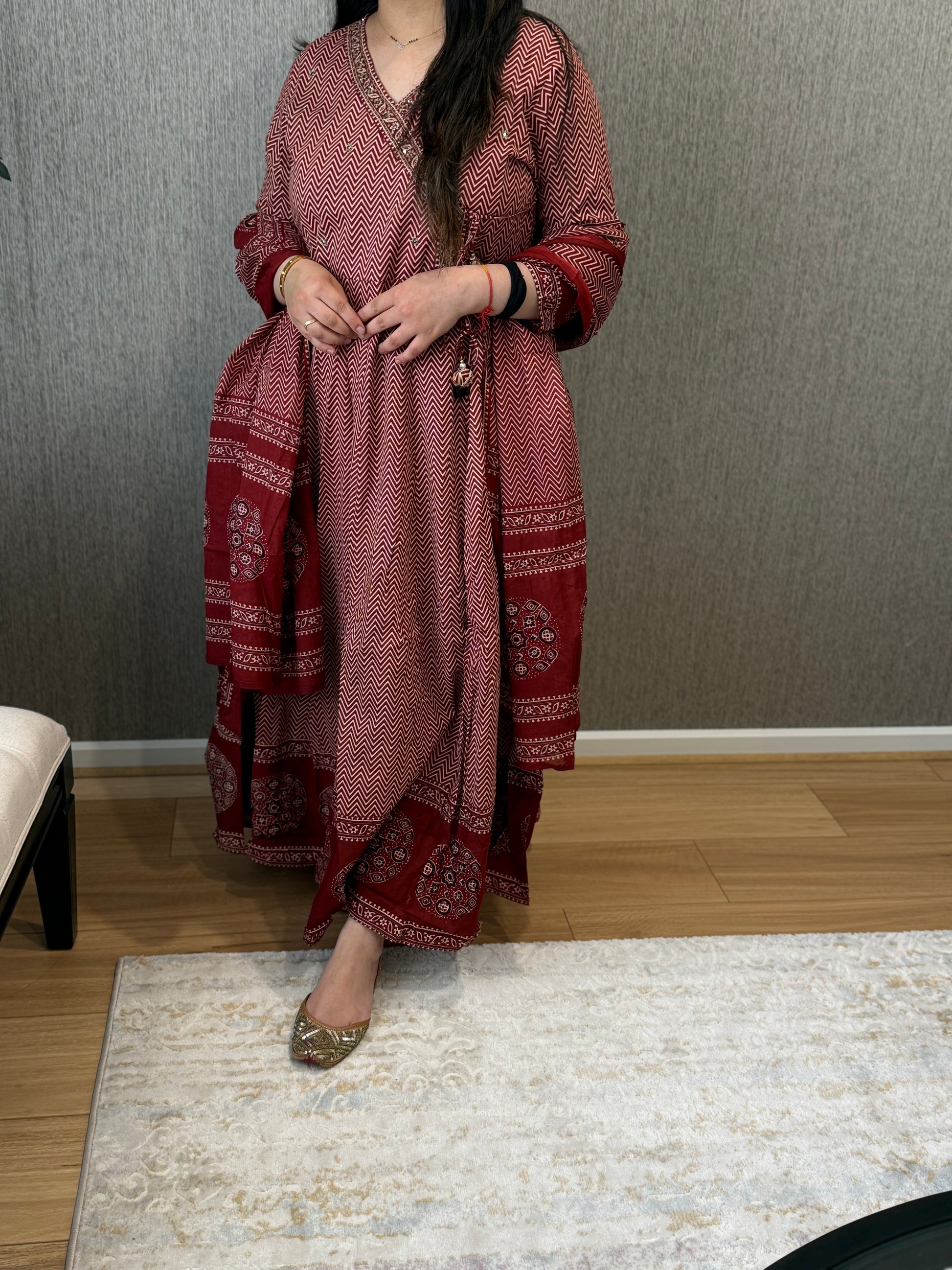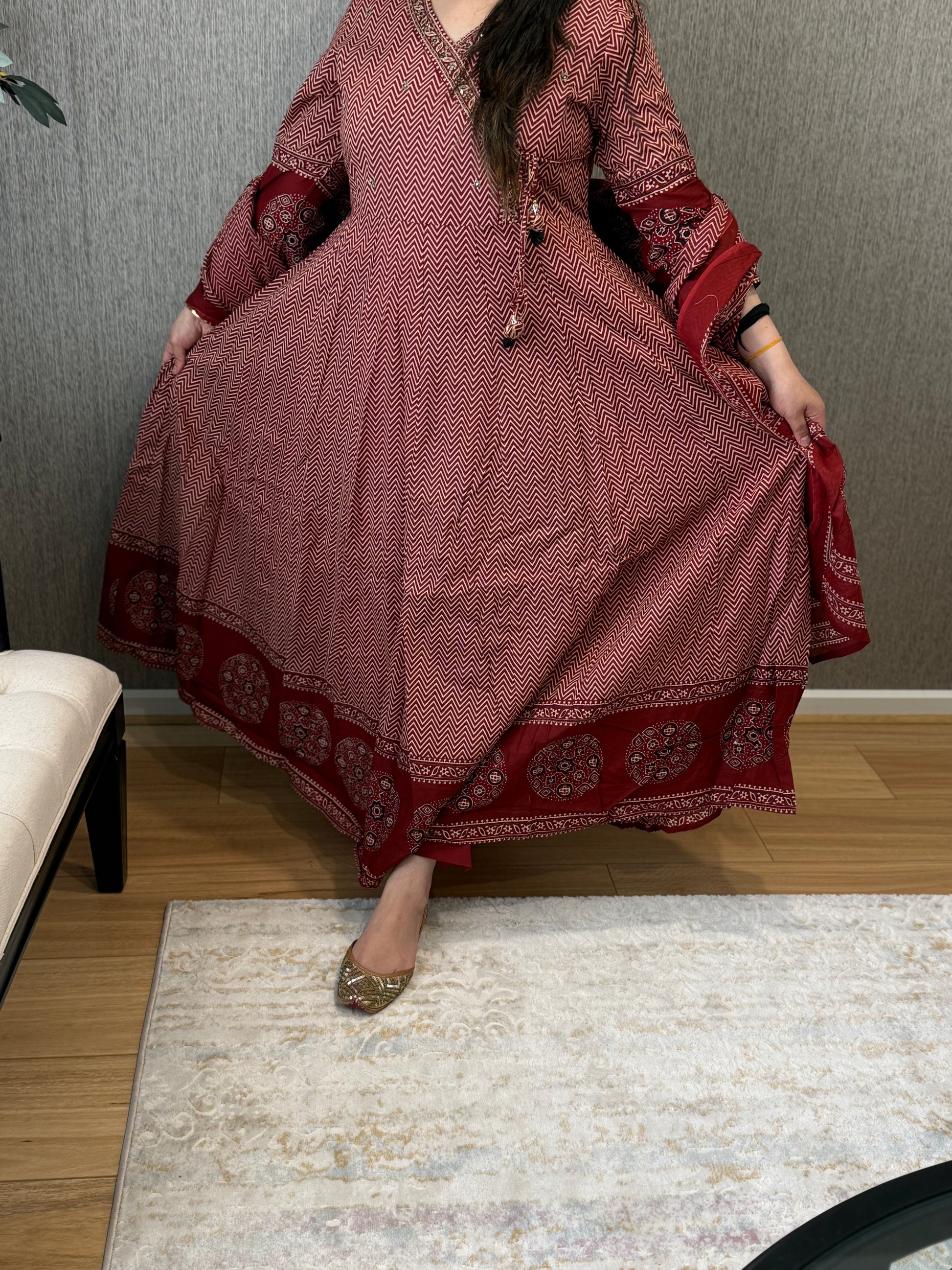 Cotton 3pc Anghrkha Anarkali with plain rust coloured pants and printed cotton dupatta