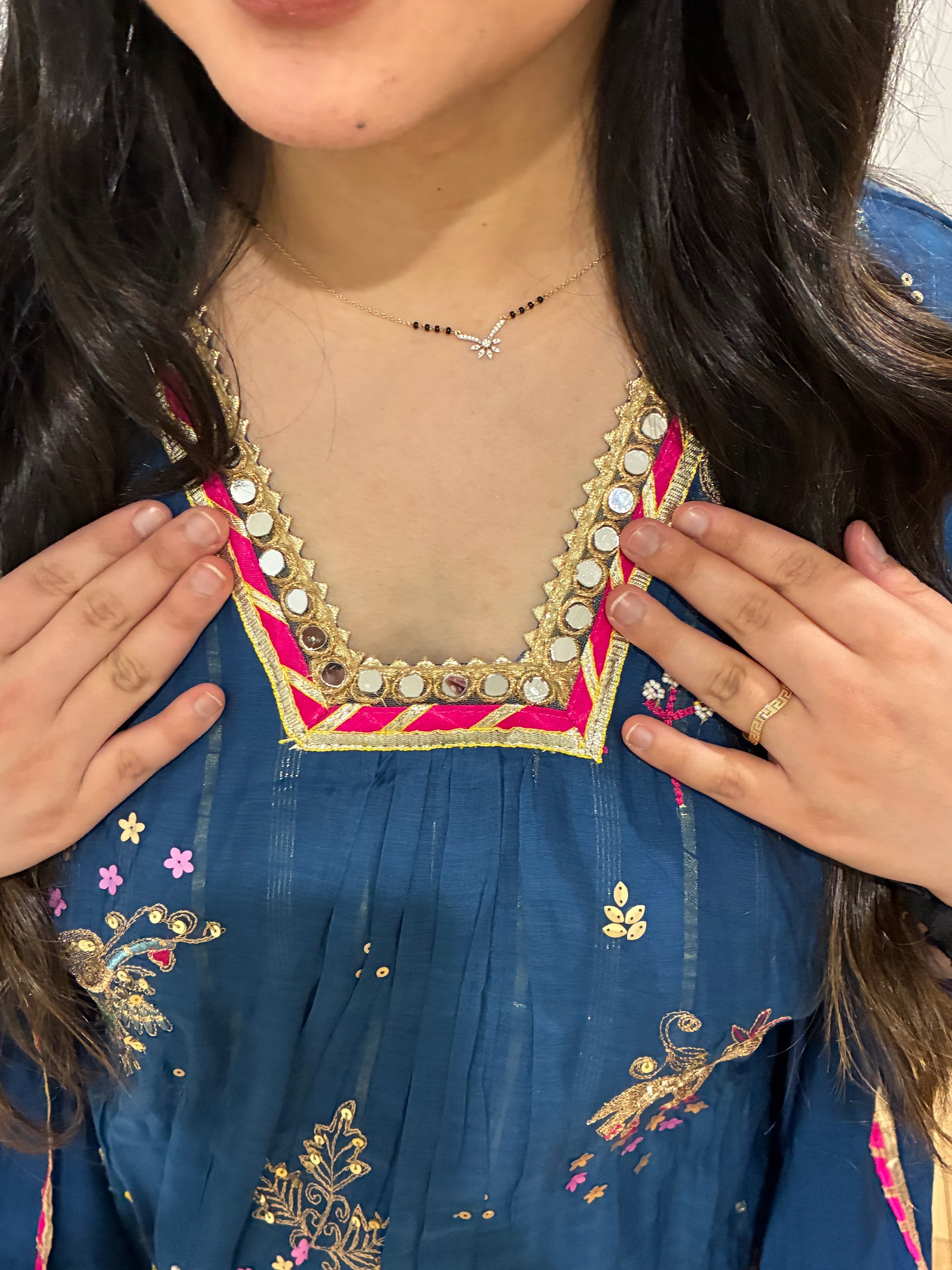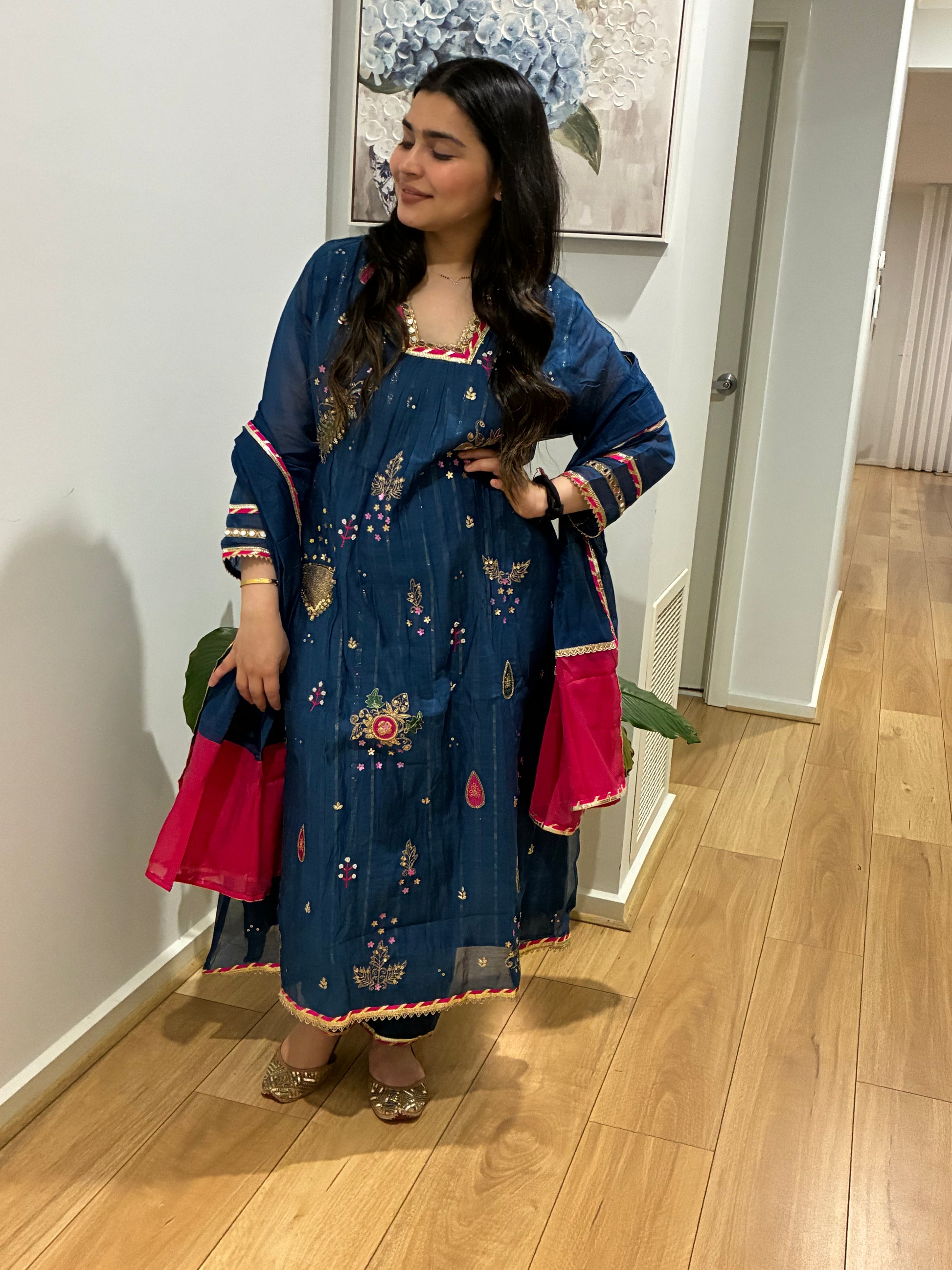 Premium quality mul chanderi aline suit with lining and handwork on the yoke and sleeves. Luxury dupatta on mul chanderi fabric and straight pants
