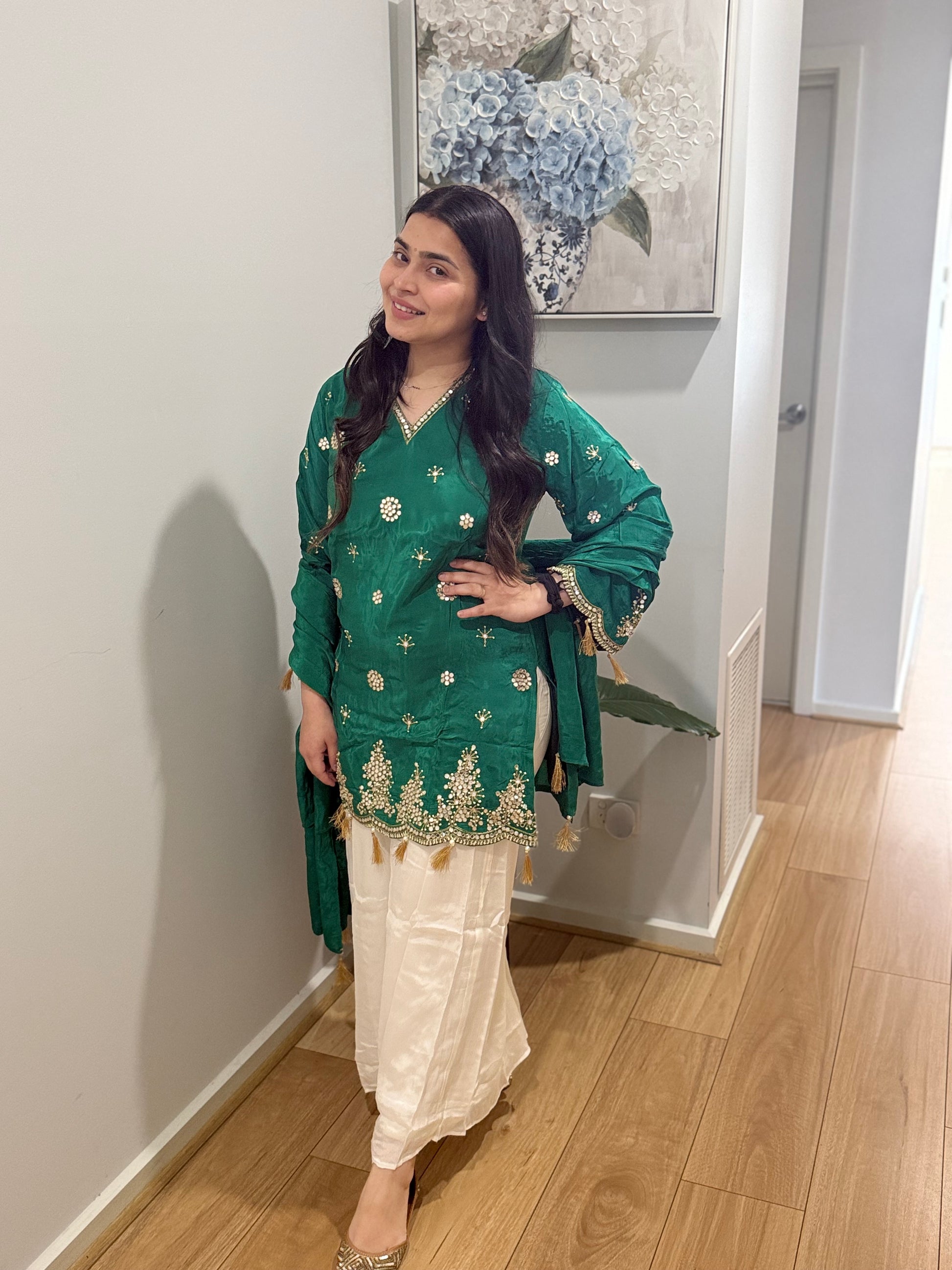 Premium quality satin silk short top with bell sleeves and chiffon plazzo and dupatta
