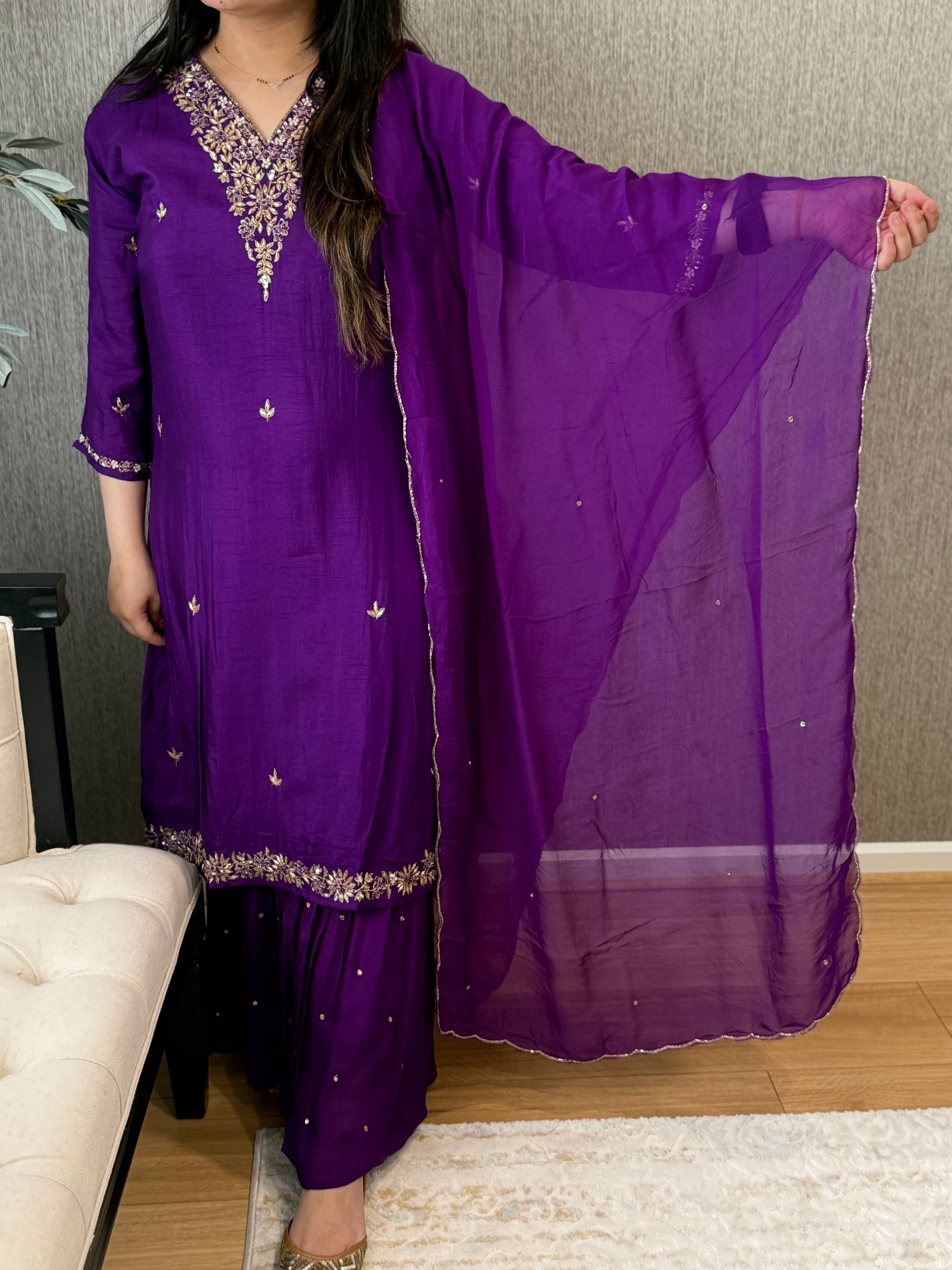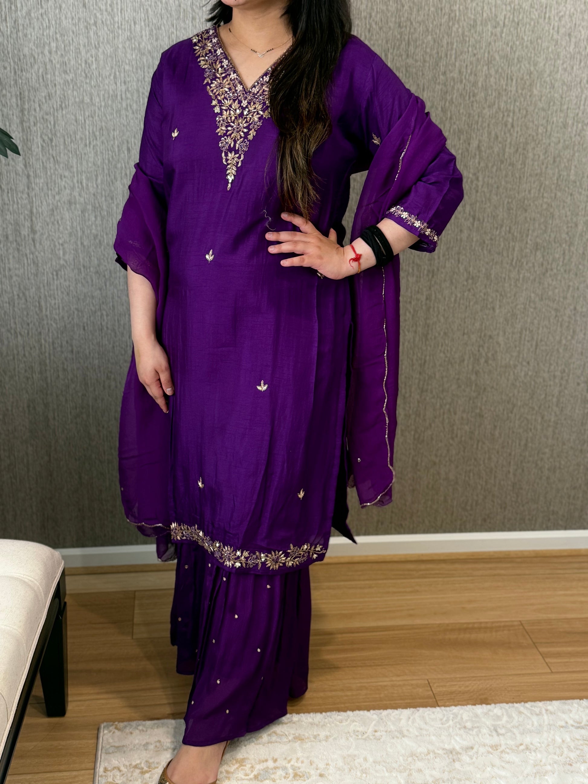 Premium quality silk suit with tissue dupatta and sharara pants