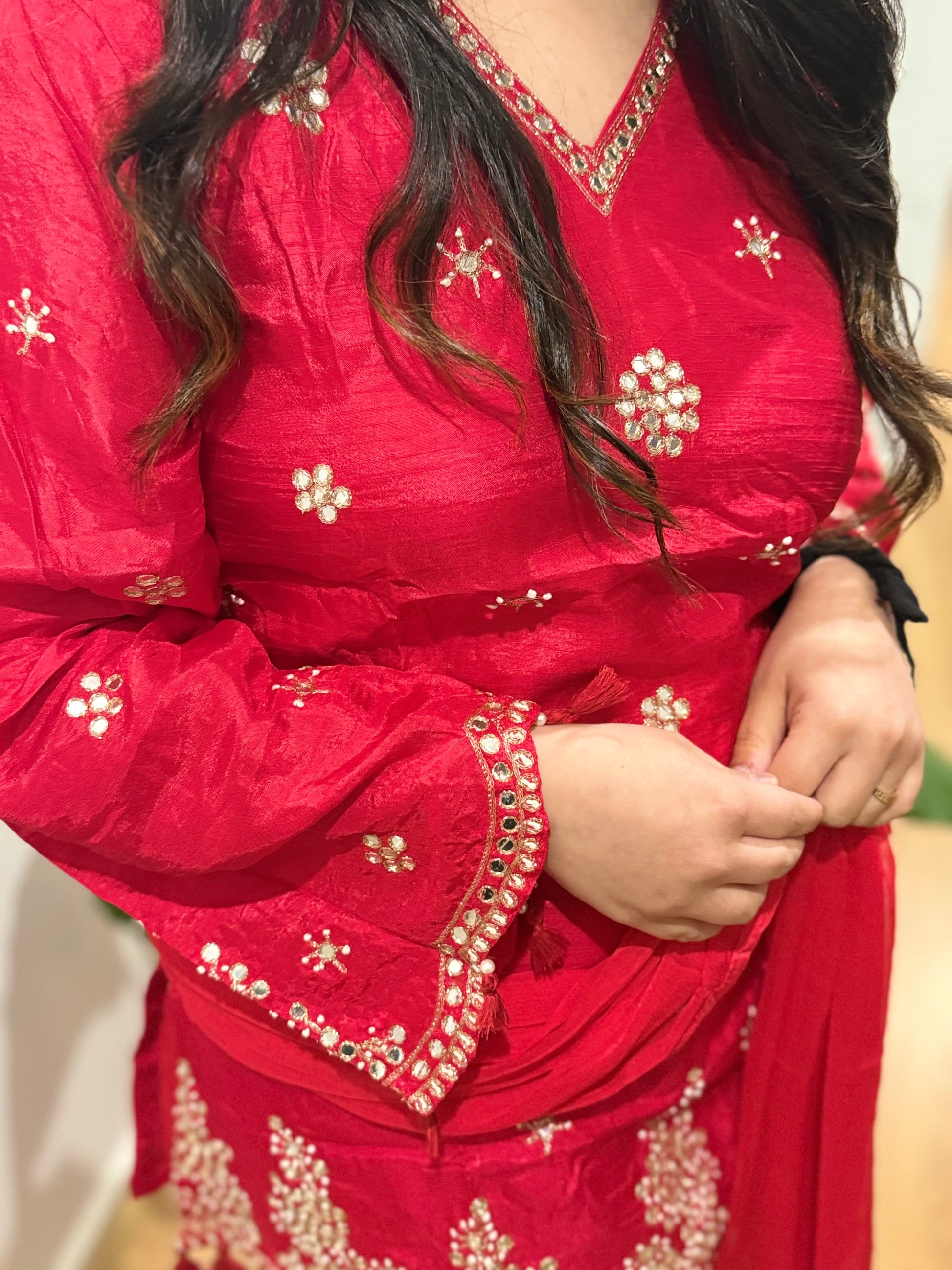 Premium quality silk short top with bell sleeves and chiffon plazzo and dupatta