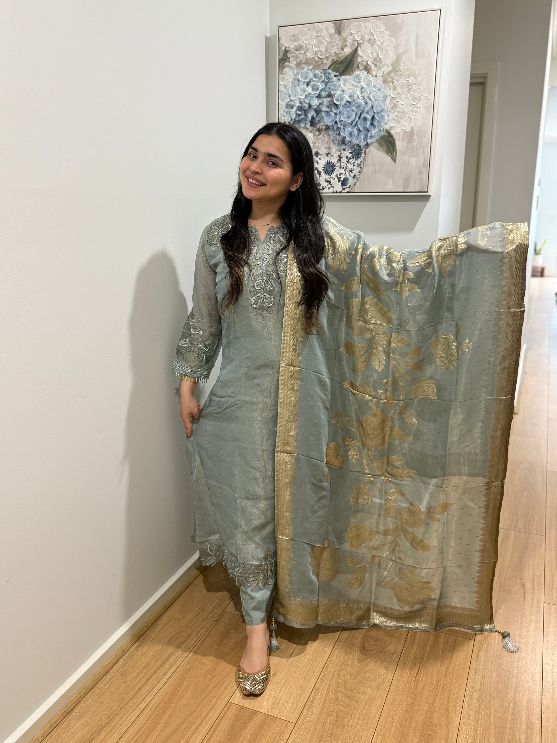 Premium quality tissue shimmer suit with pants and banarsi weave dupatta