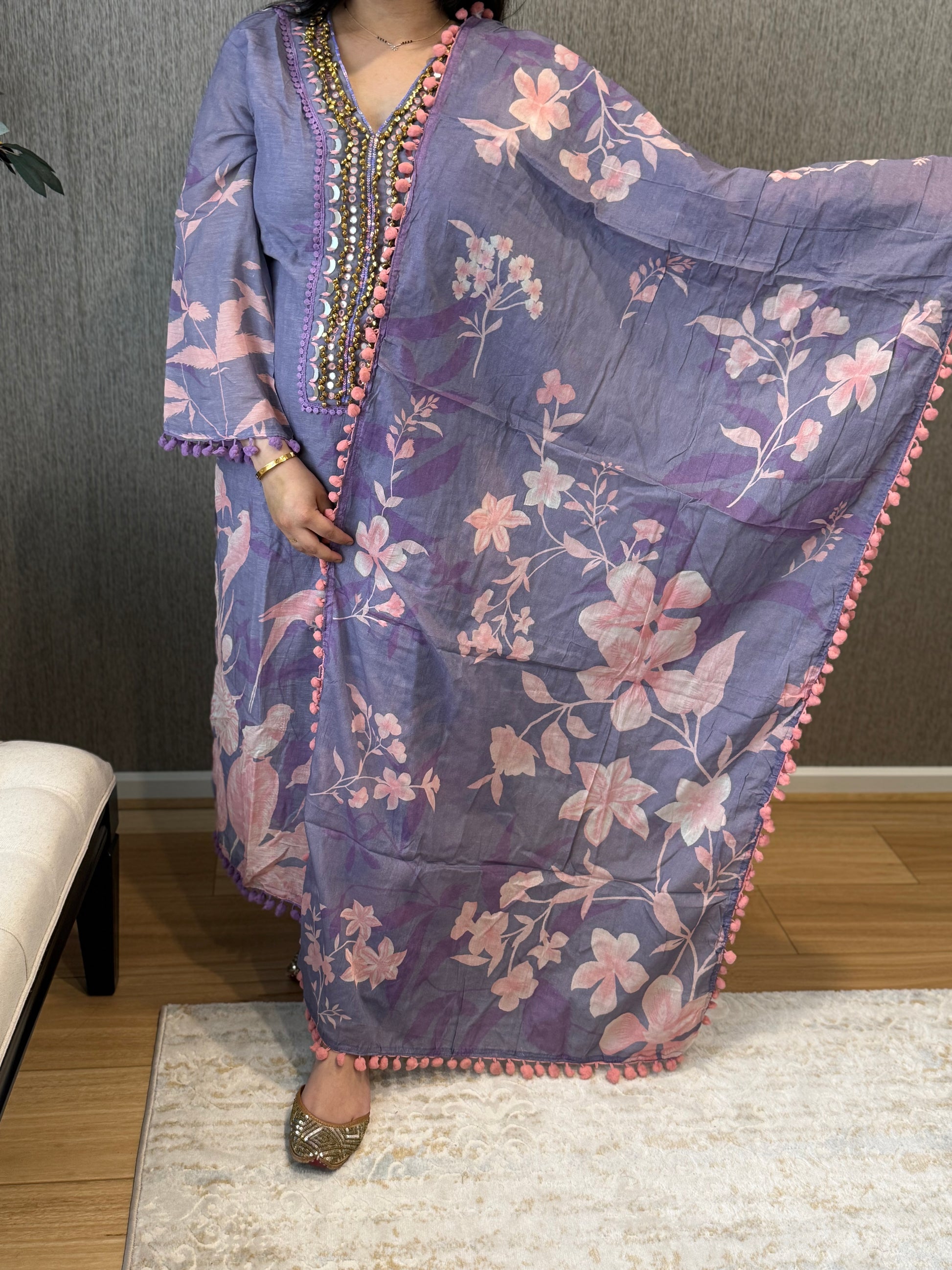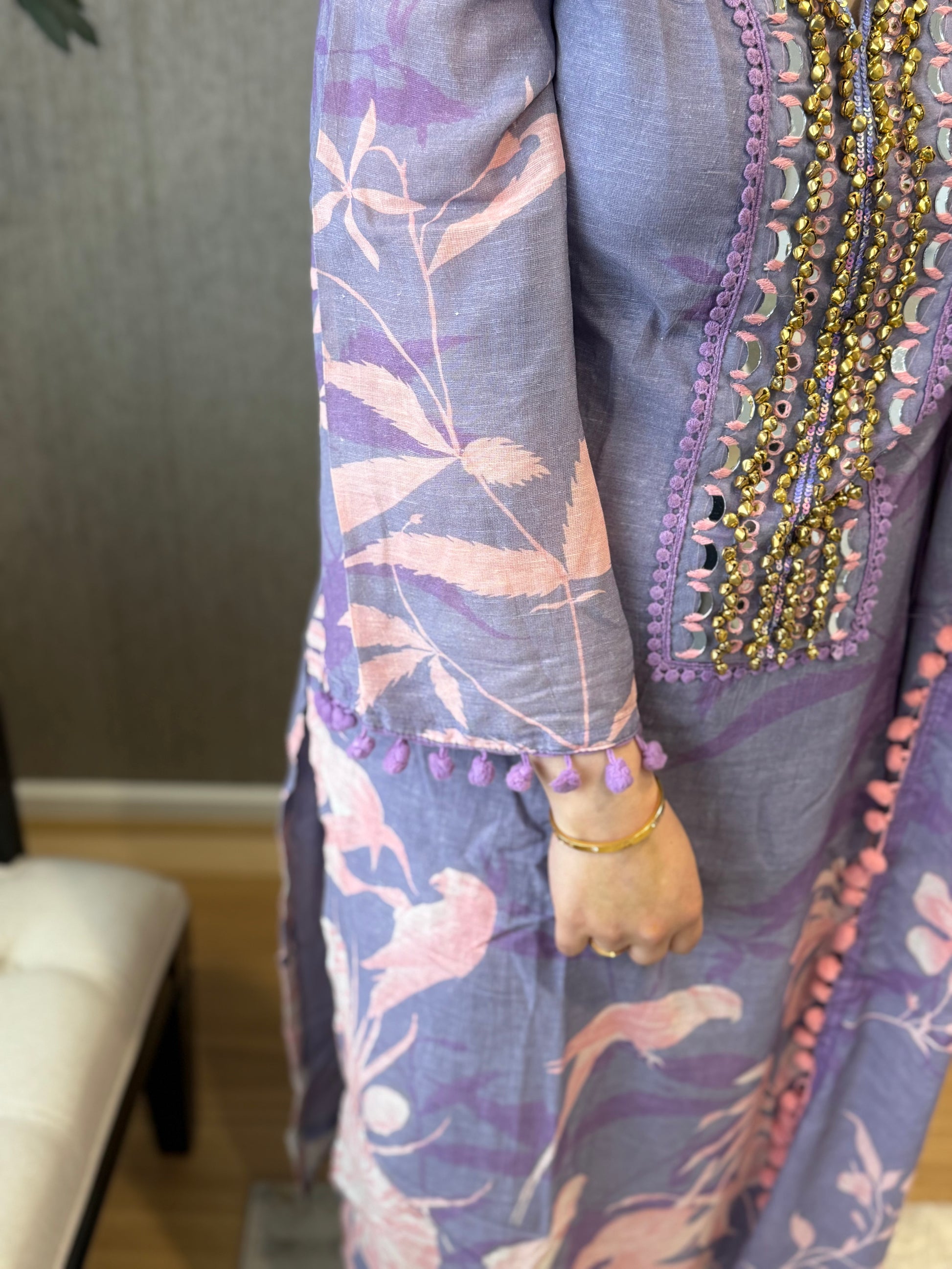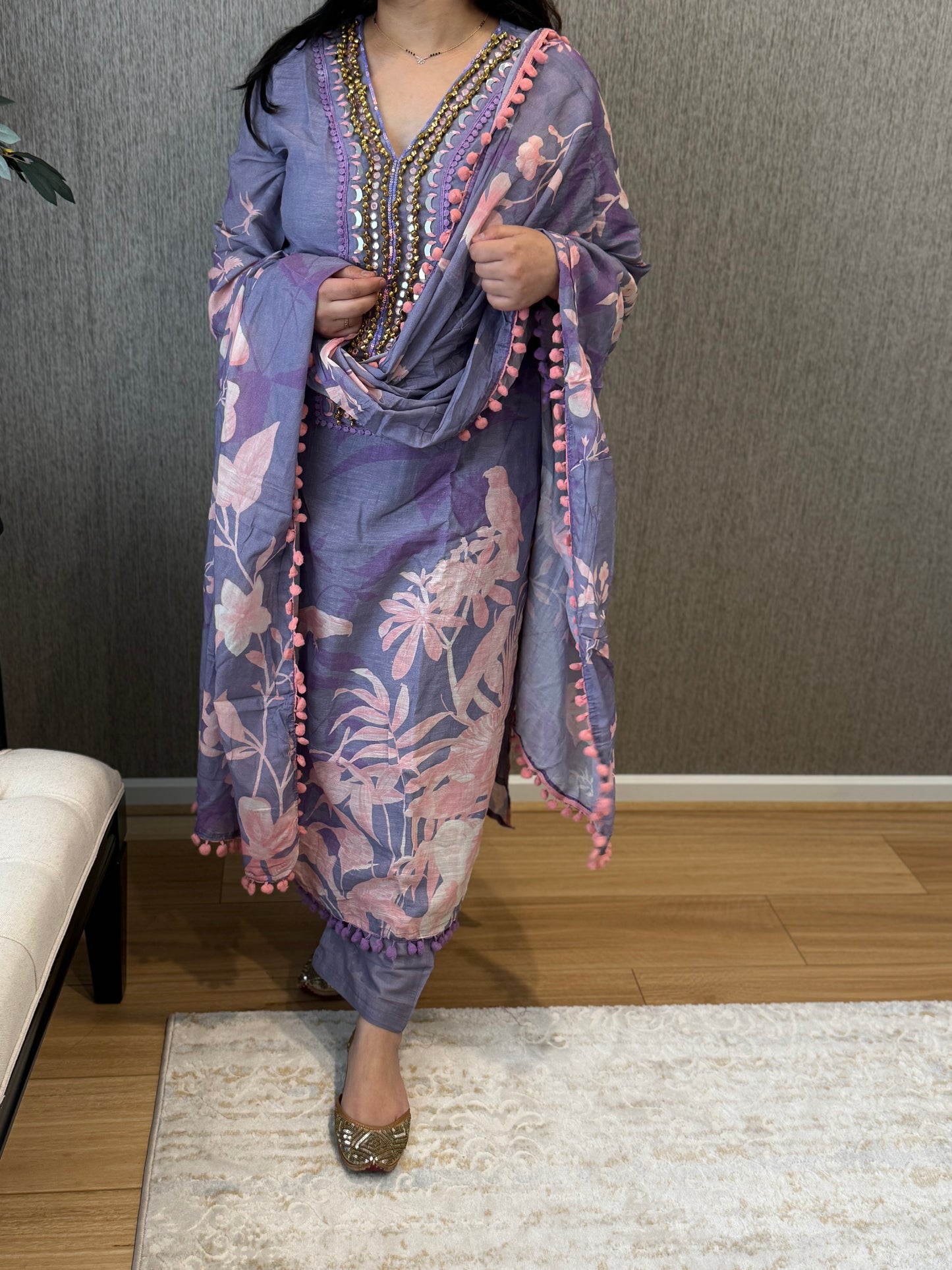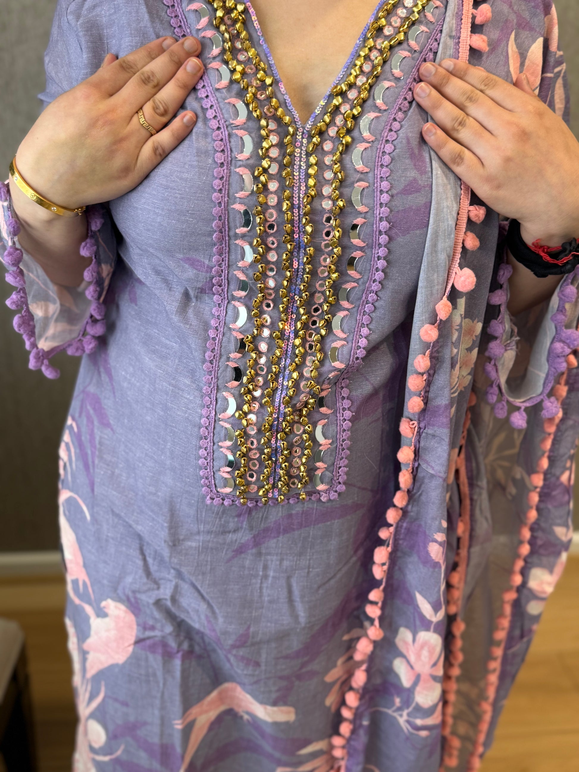 Premium quality cotton suit with lining and straight pants. Mirror and ghunghroo work on the yoke.