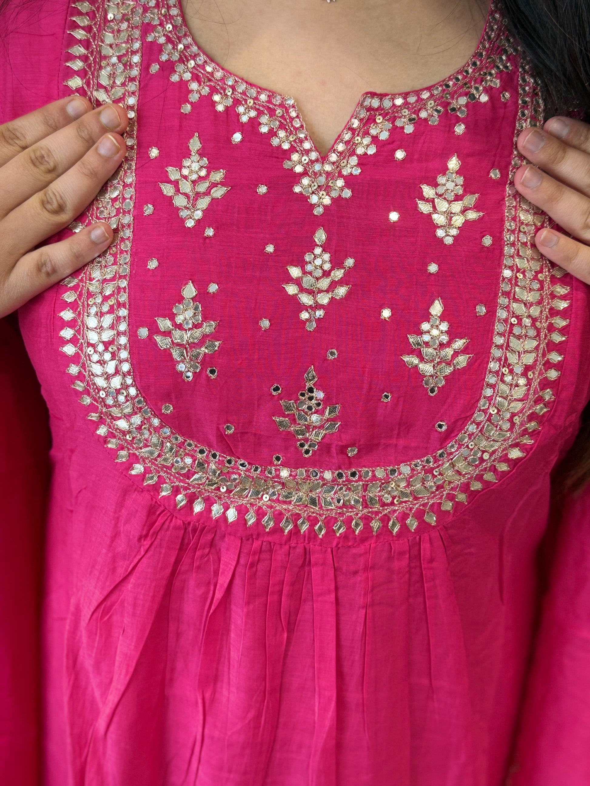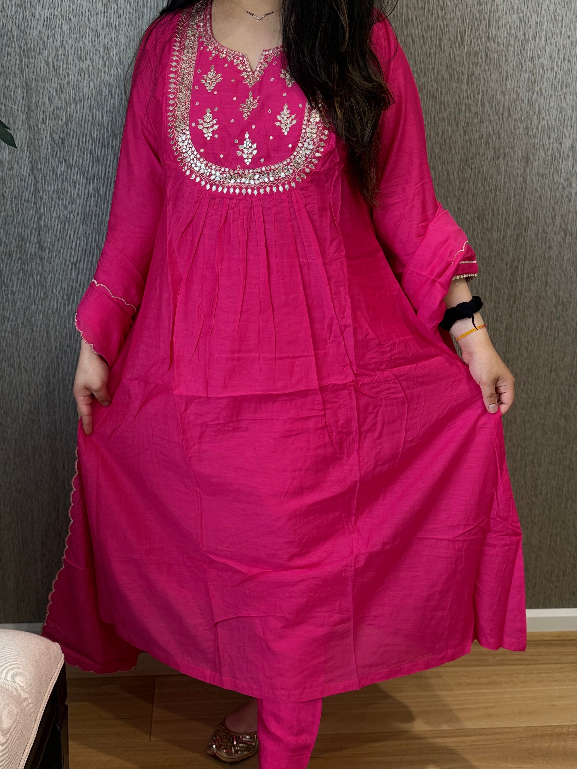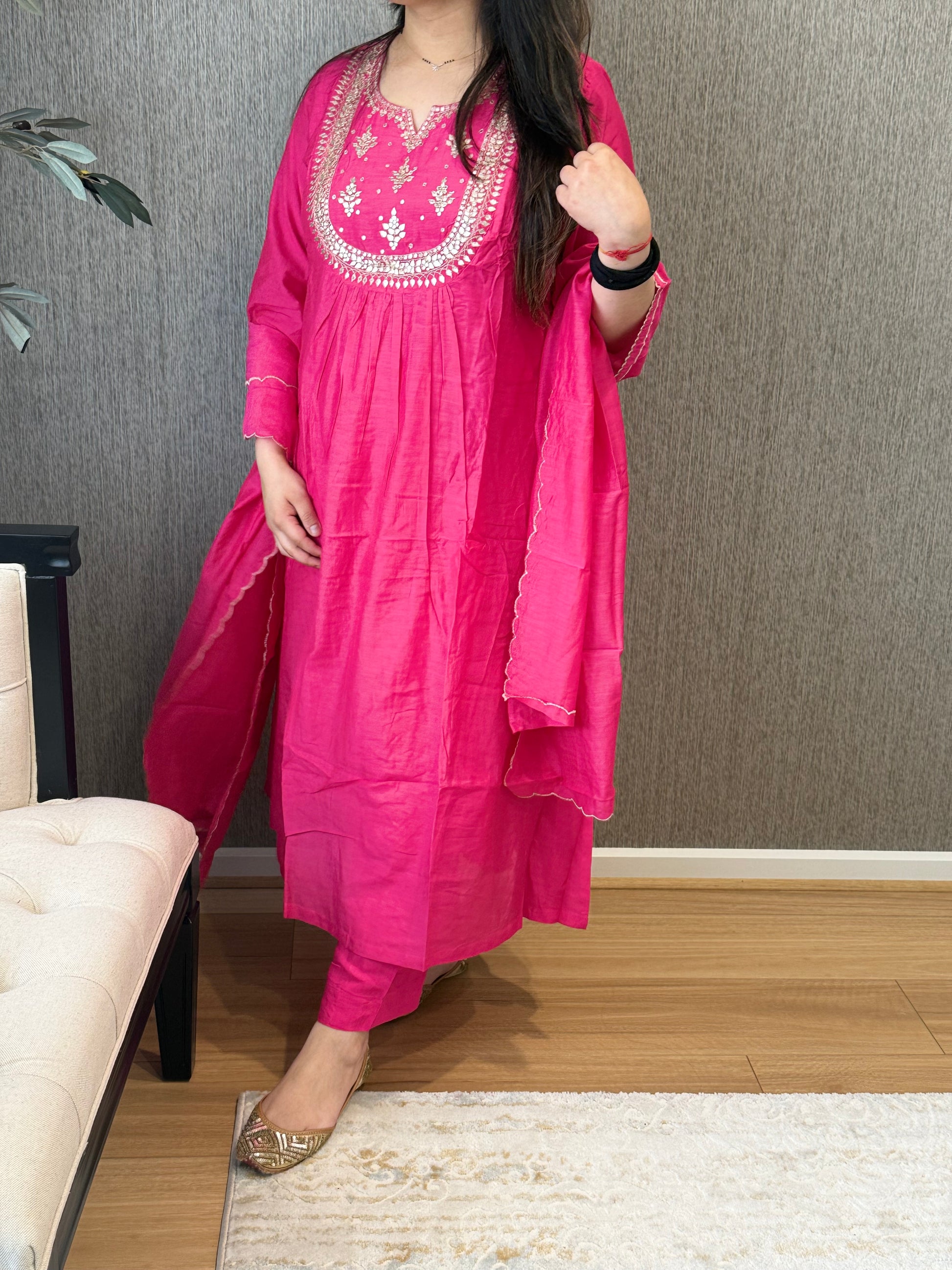 Premium quality mul chanderi aline suit with lining and handwork on the yoke and sleeves. Luxury dupatta on mul chanderi fabric and straight pants