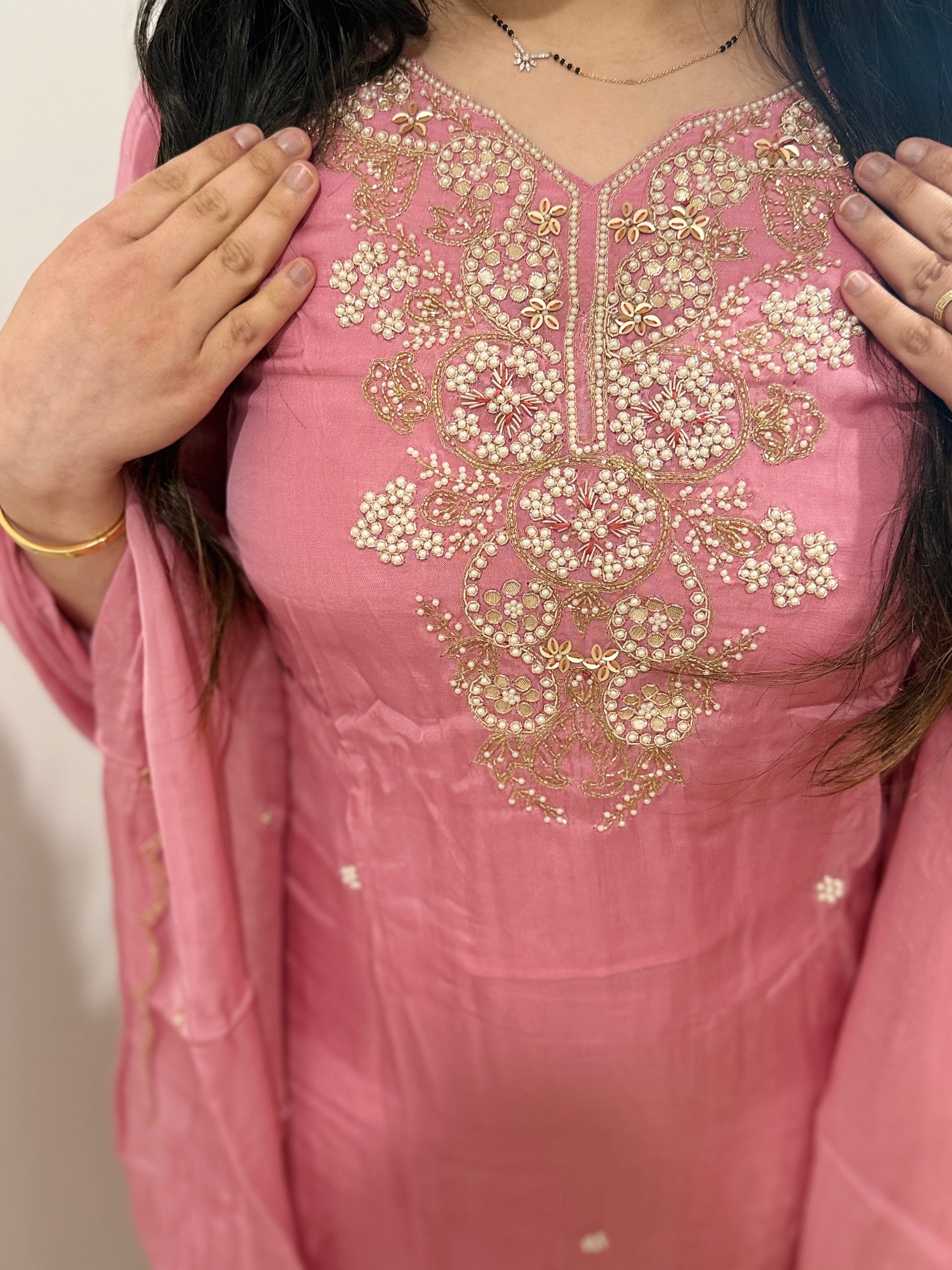 All handwork on the suit with zari and sequin work