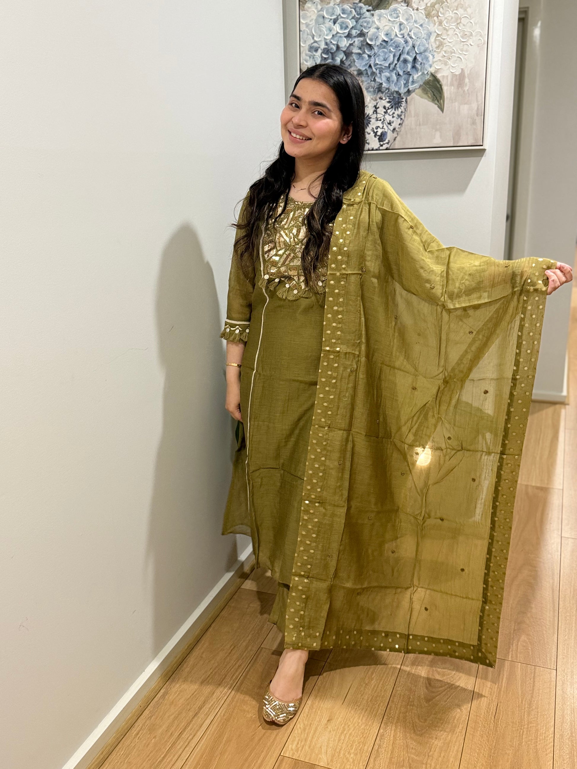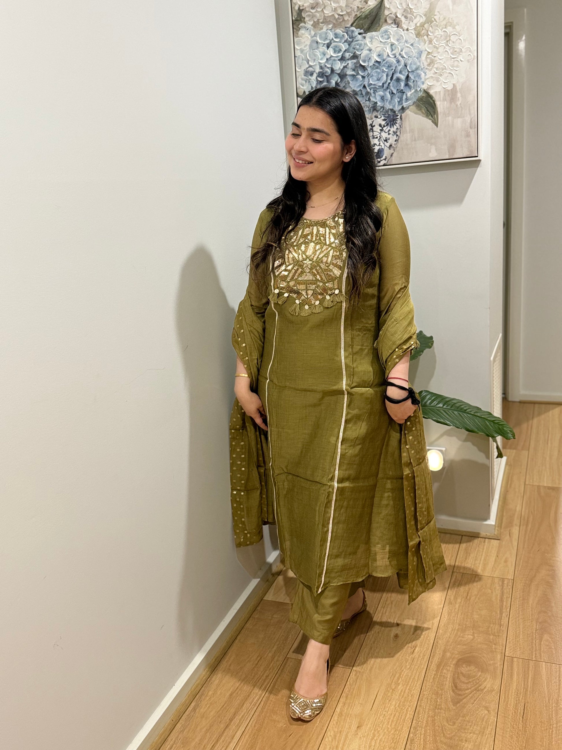 Premium quality mul chanderi anarkali suit with lining and handwork on the yoke and sleeves. Luxury dupatta on mulchanderi fabric and straight pants