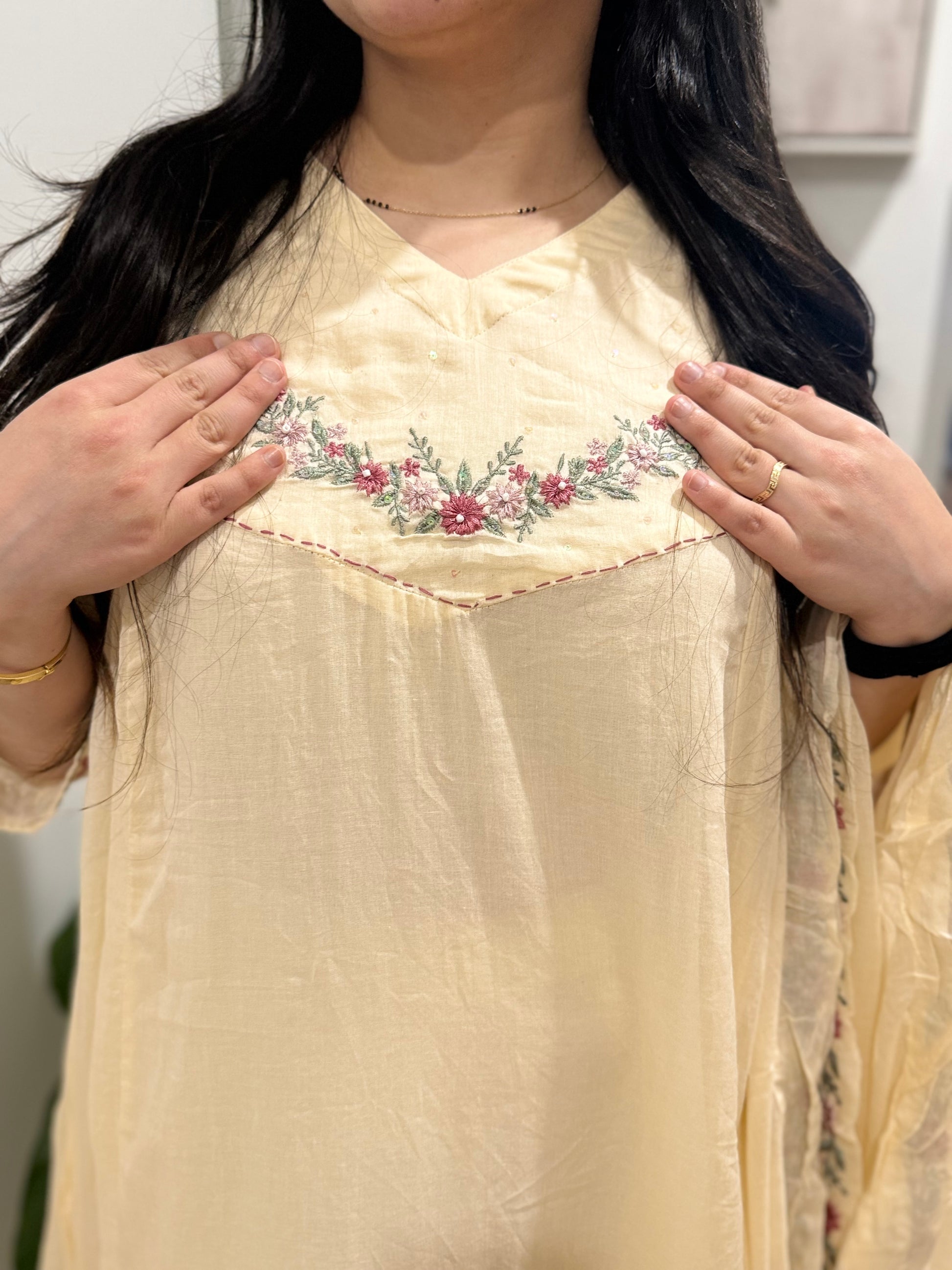Premium quality mul cotton Anarkali with lining and embroidery on the yoke and sleeves. Luxury mul cotton dupatta