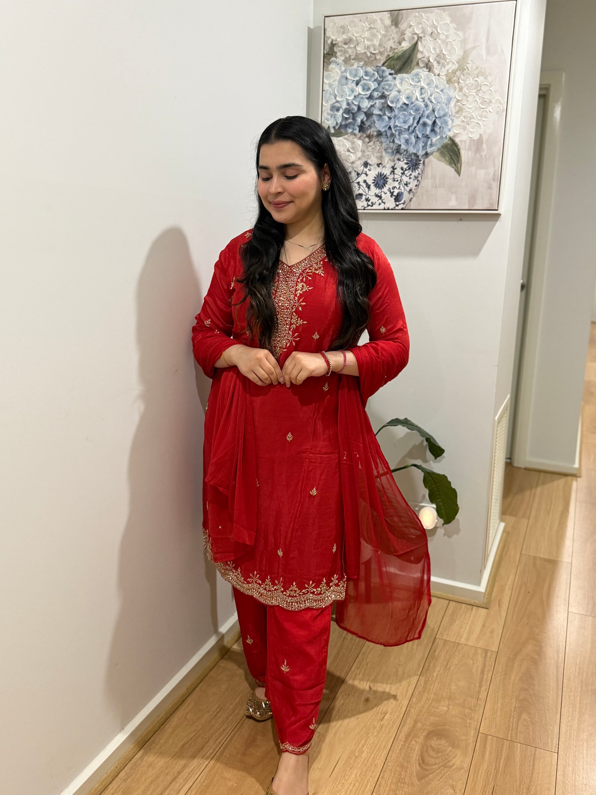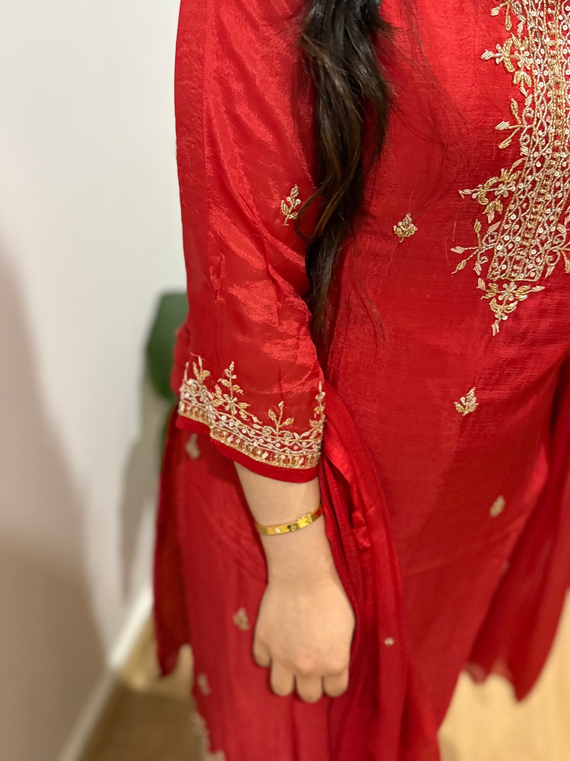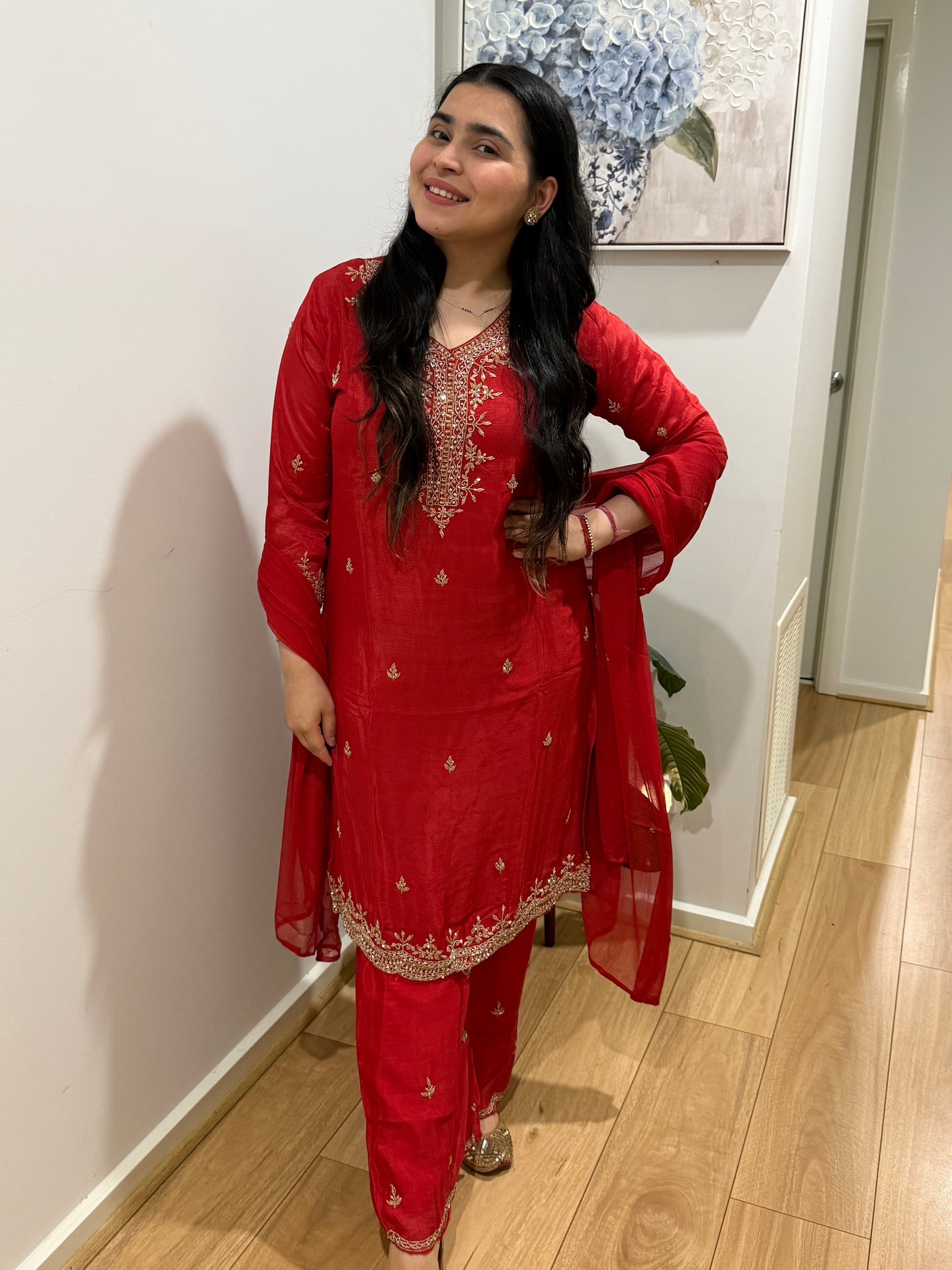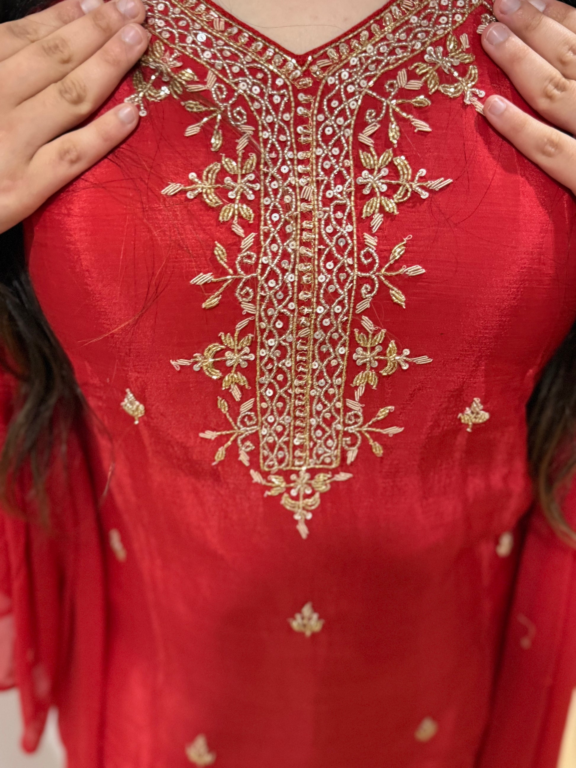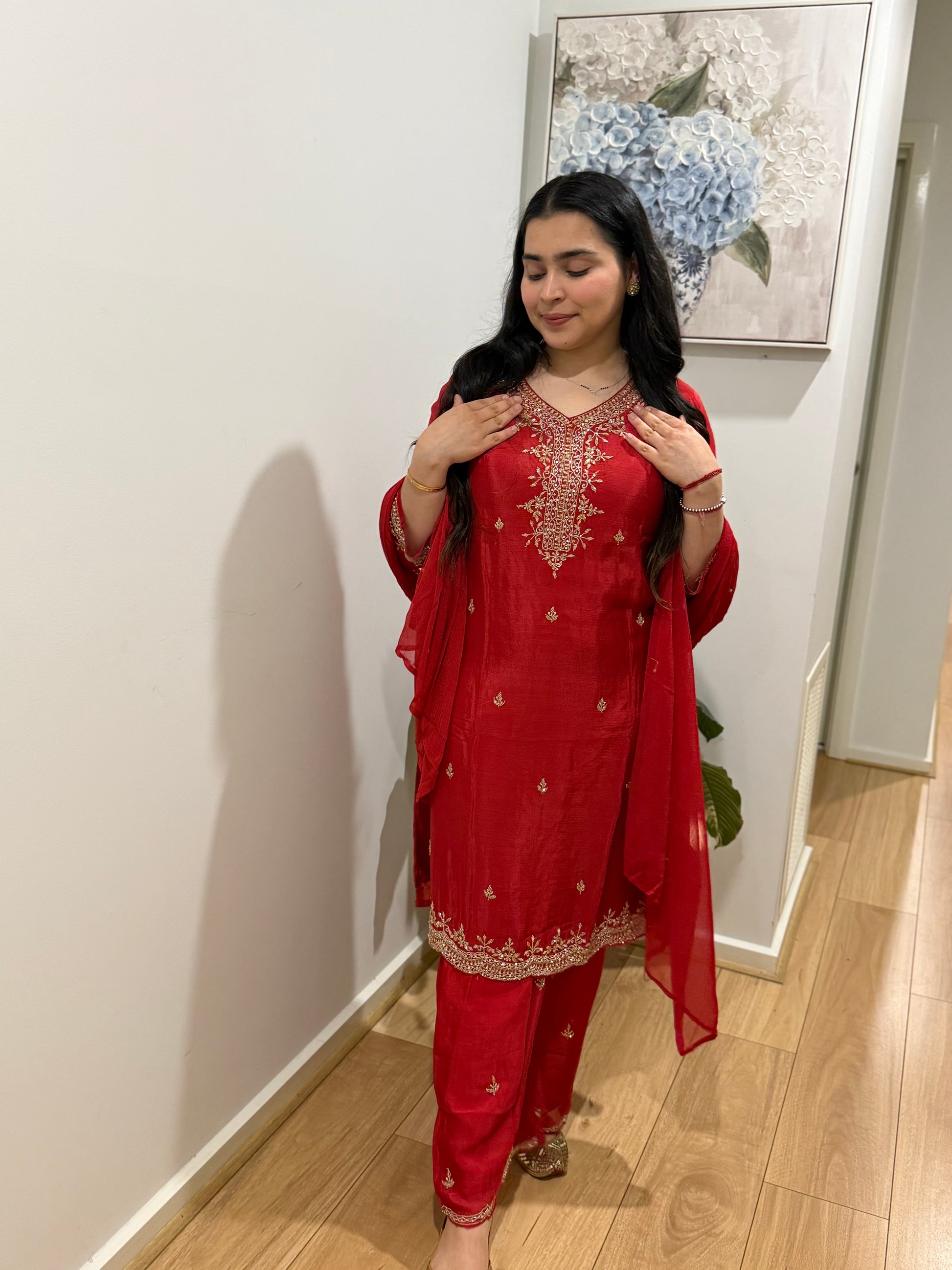 Premium pure chiffon suit with divider plazzo, handwork throughout and chiffon dupatta