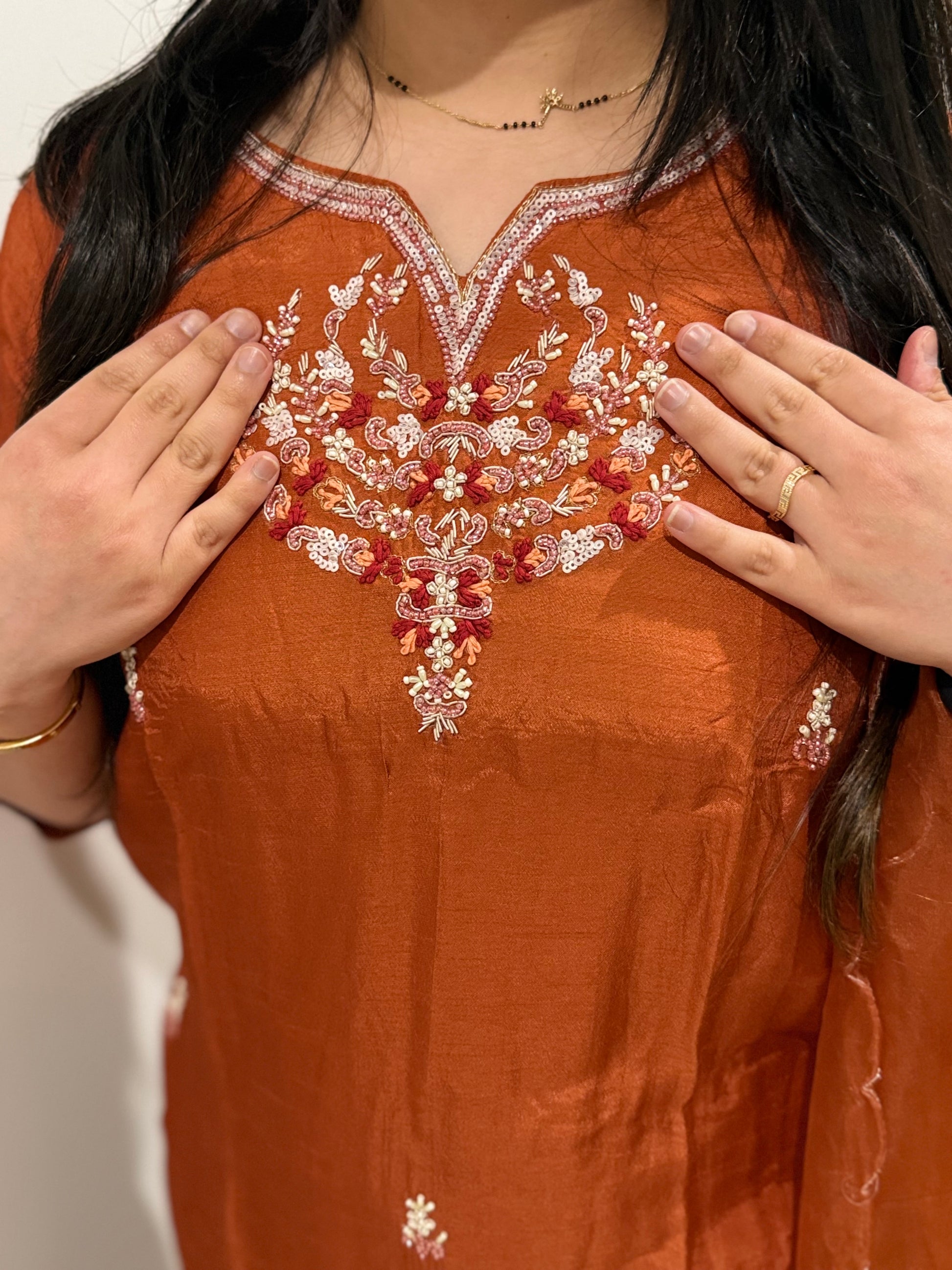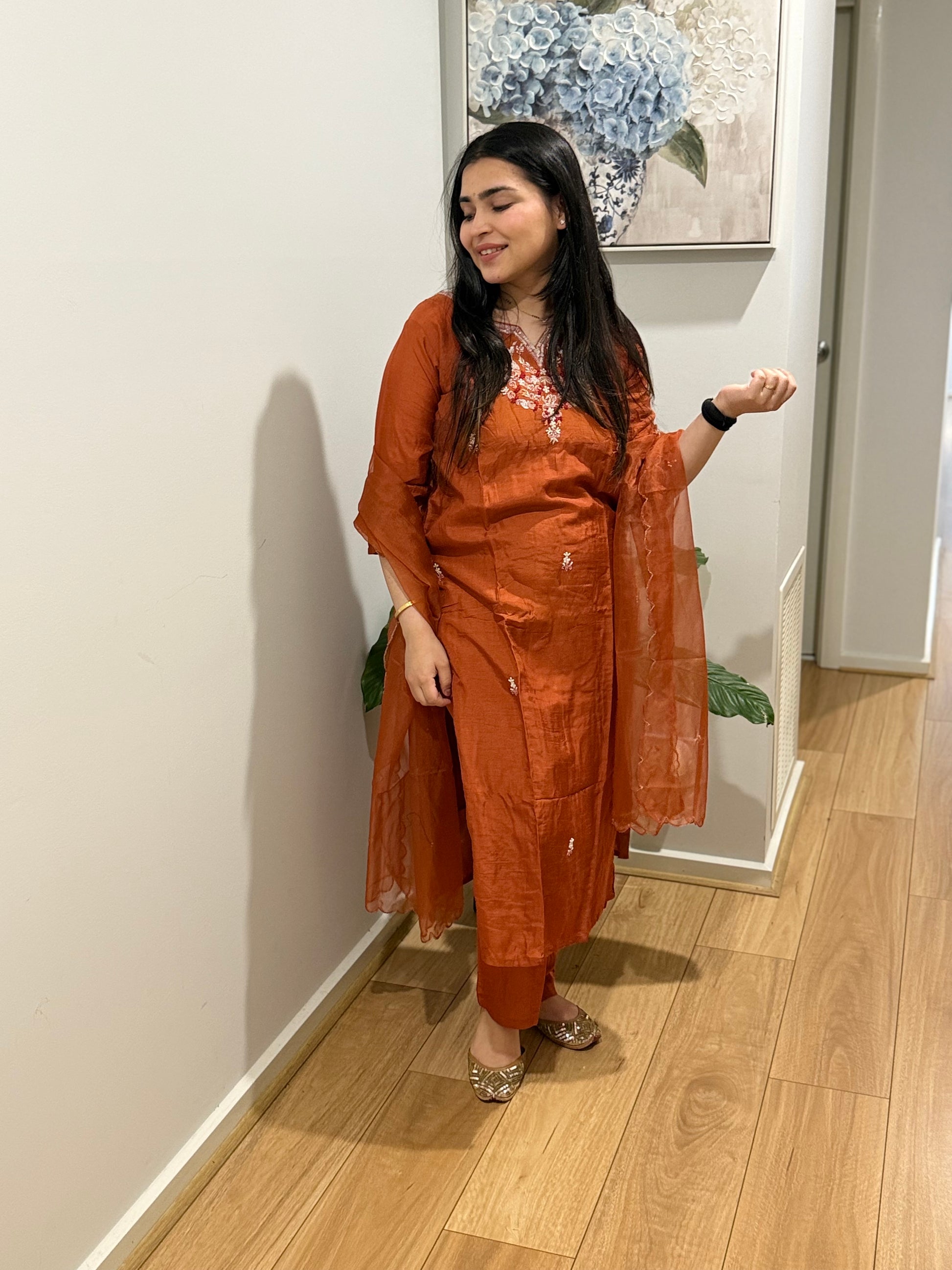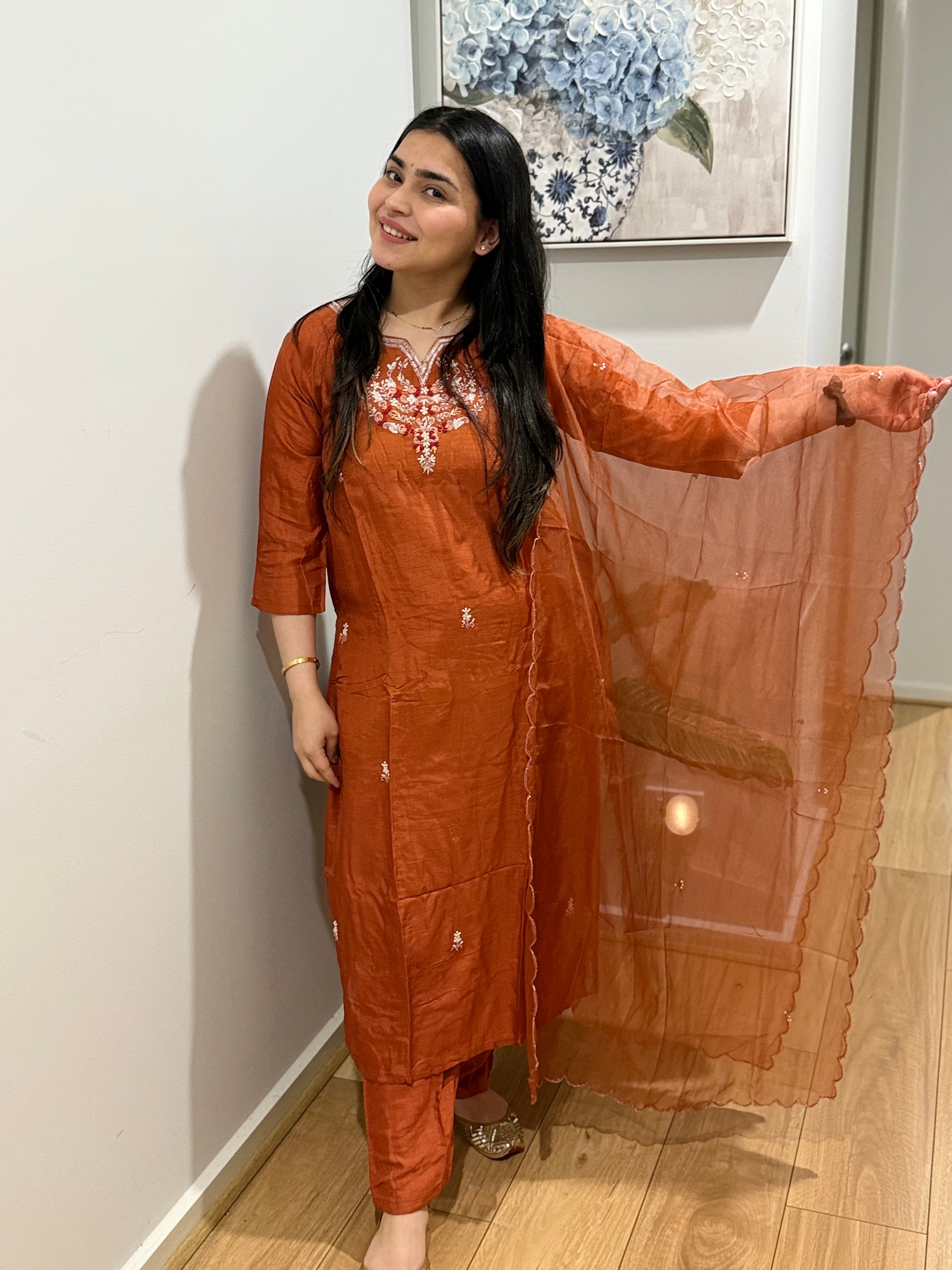 Premium quality silk suit with pants and organza dupatta