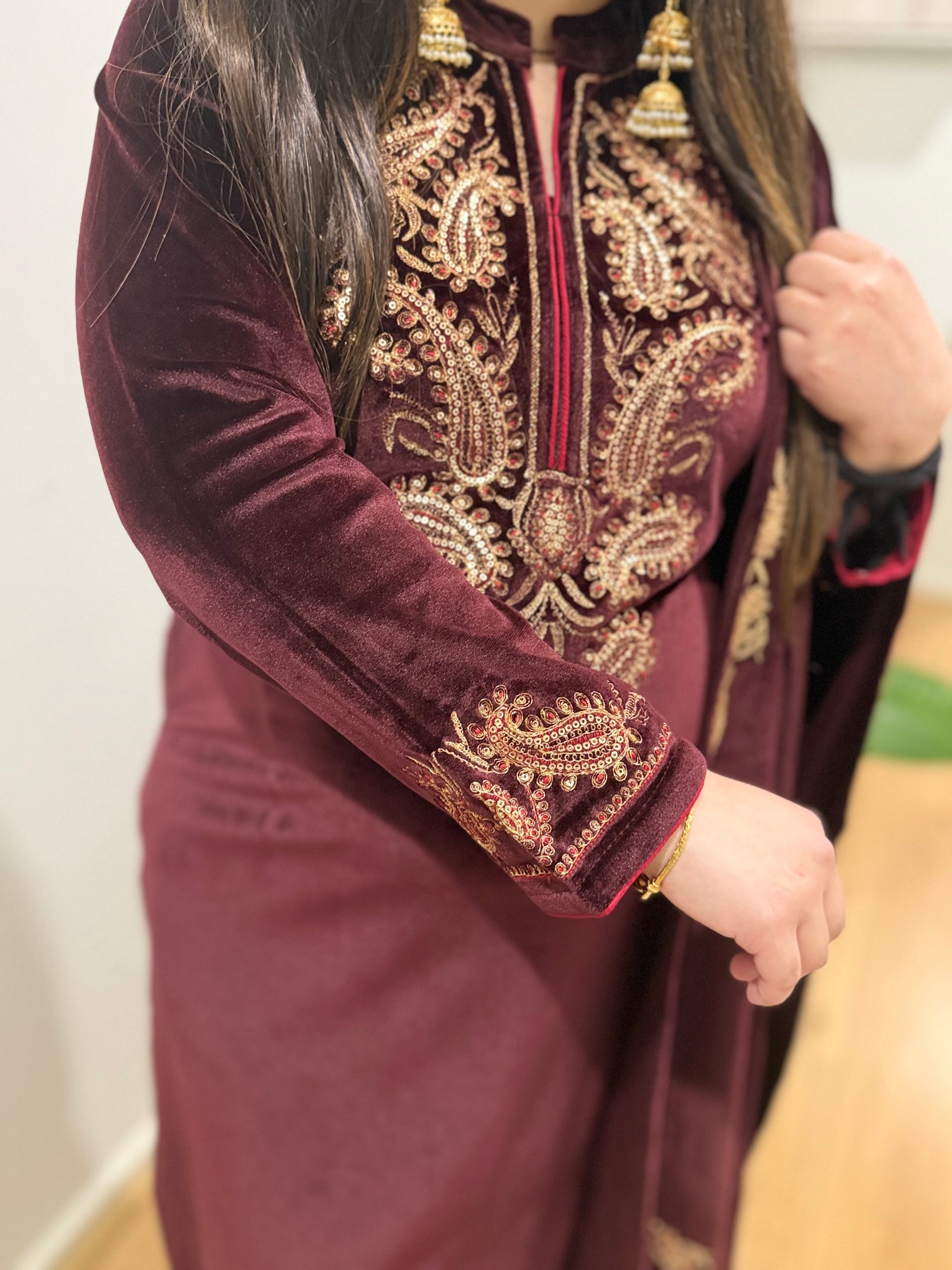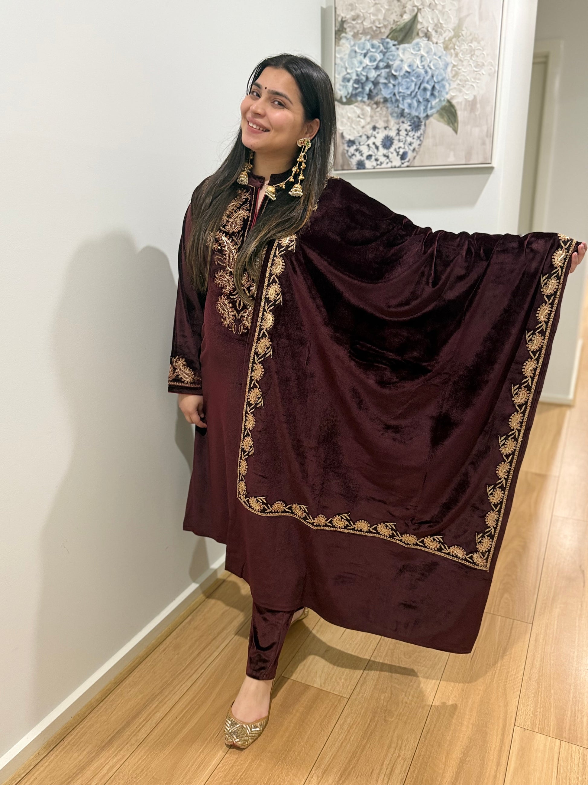 Butter Velvet Three Piece Suit with Velvet Shawl