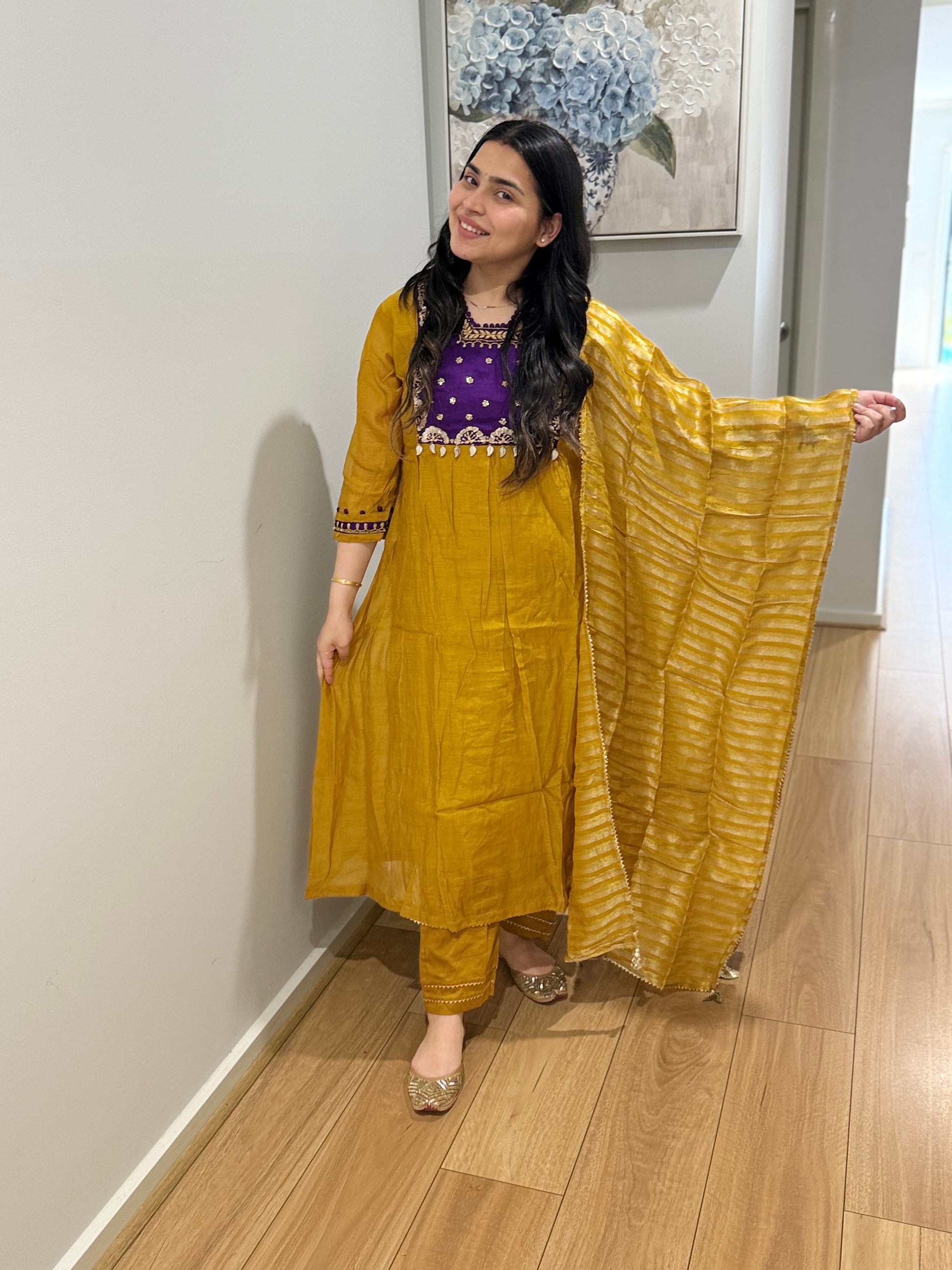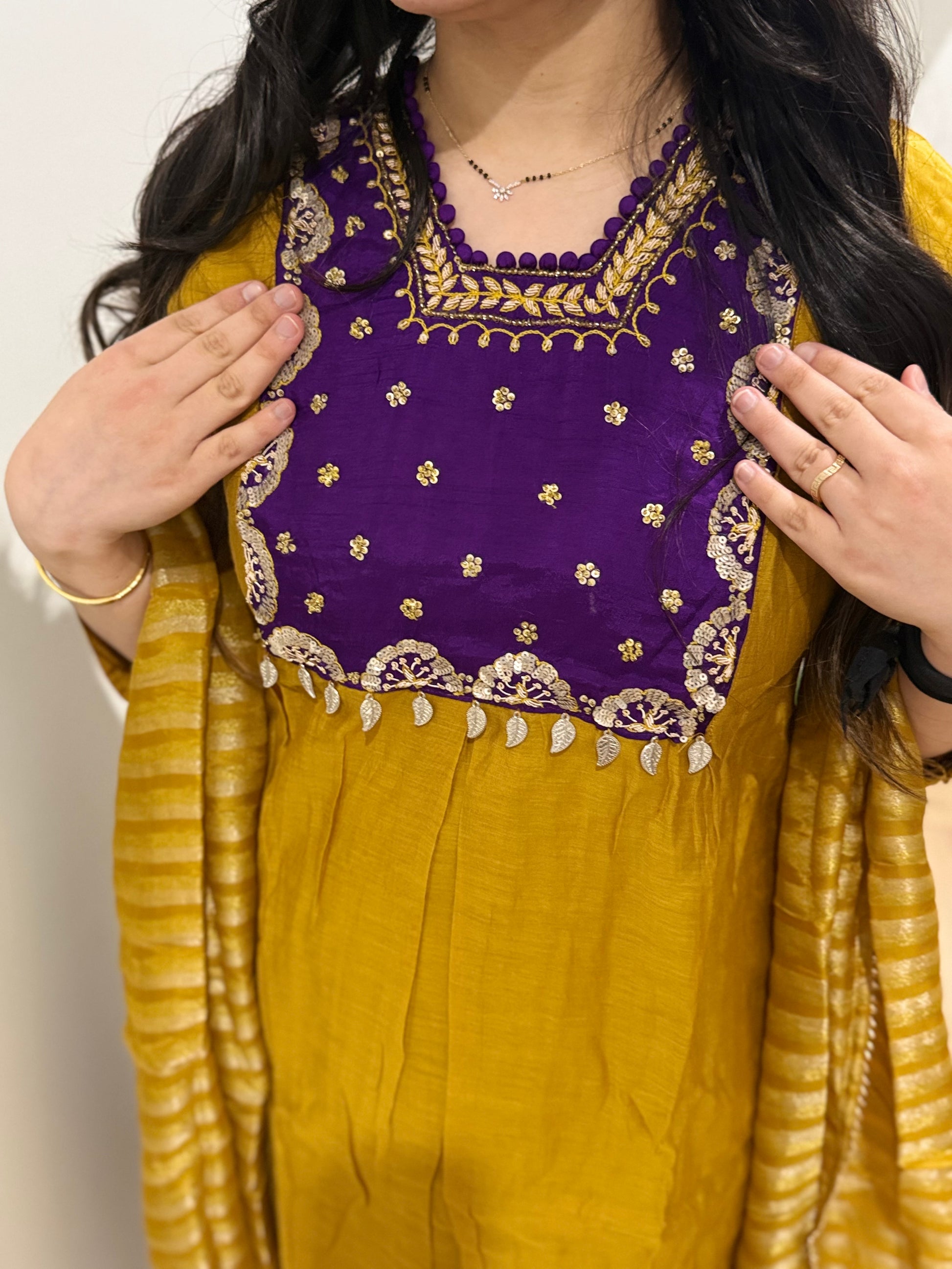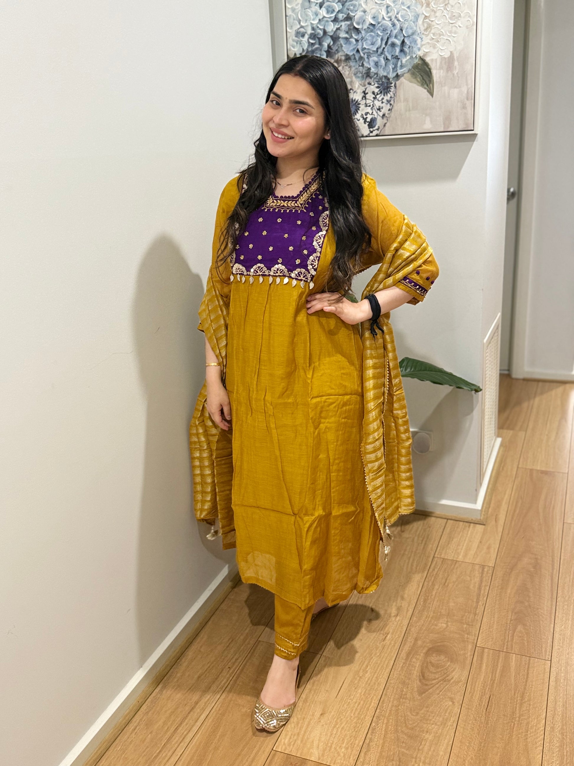 Premium quality mul chanderi anarkali suit with lining and handwork on the yoke and sleeves. Luxury dupatta on tissue fabric and straight pants